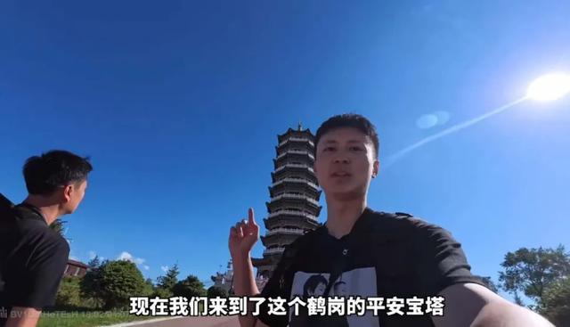 那天他们一起去了鹤岗的标志性建筑平安宝塔看风景,用无人机拍视频。